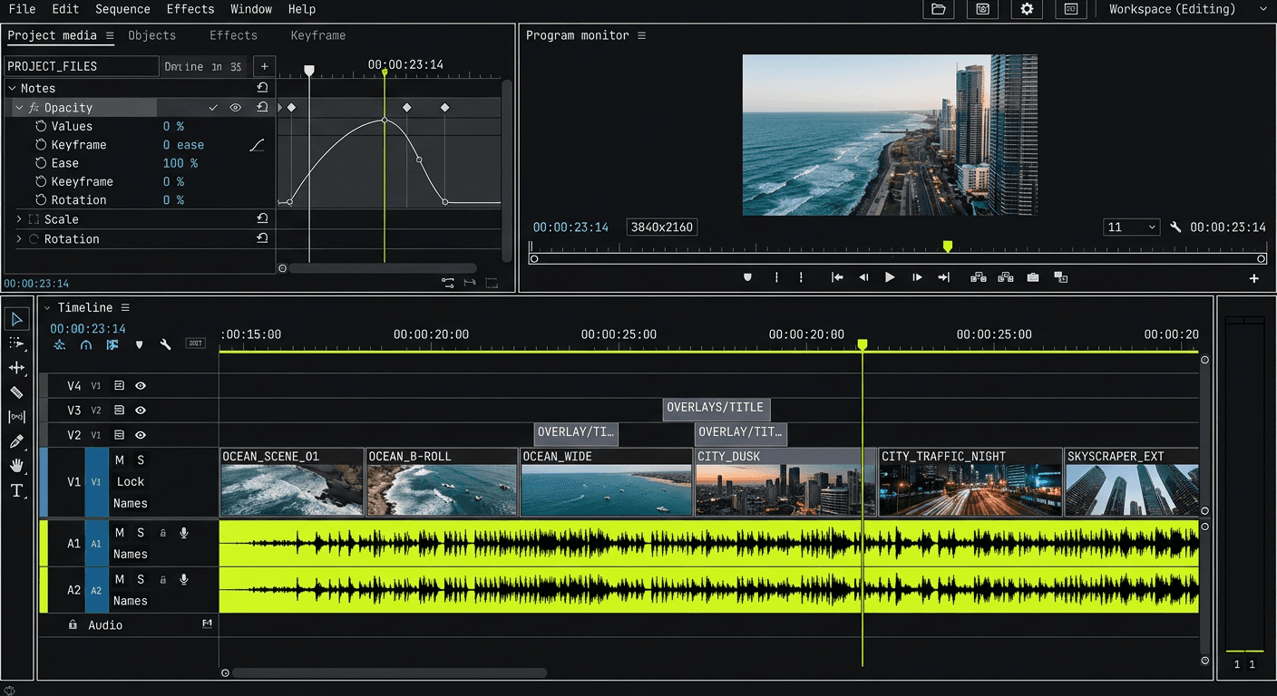 Fade, slide, zoom, blur, wipe — cada clip tem transição de entrada e saída independente. Legendas animadas, stroke e posicionamento um-clique.